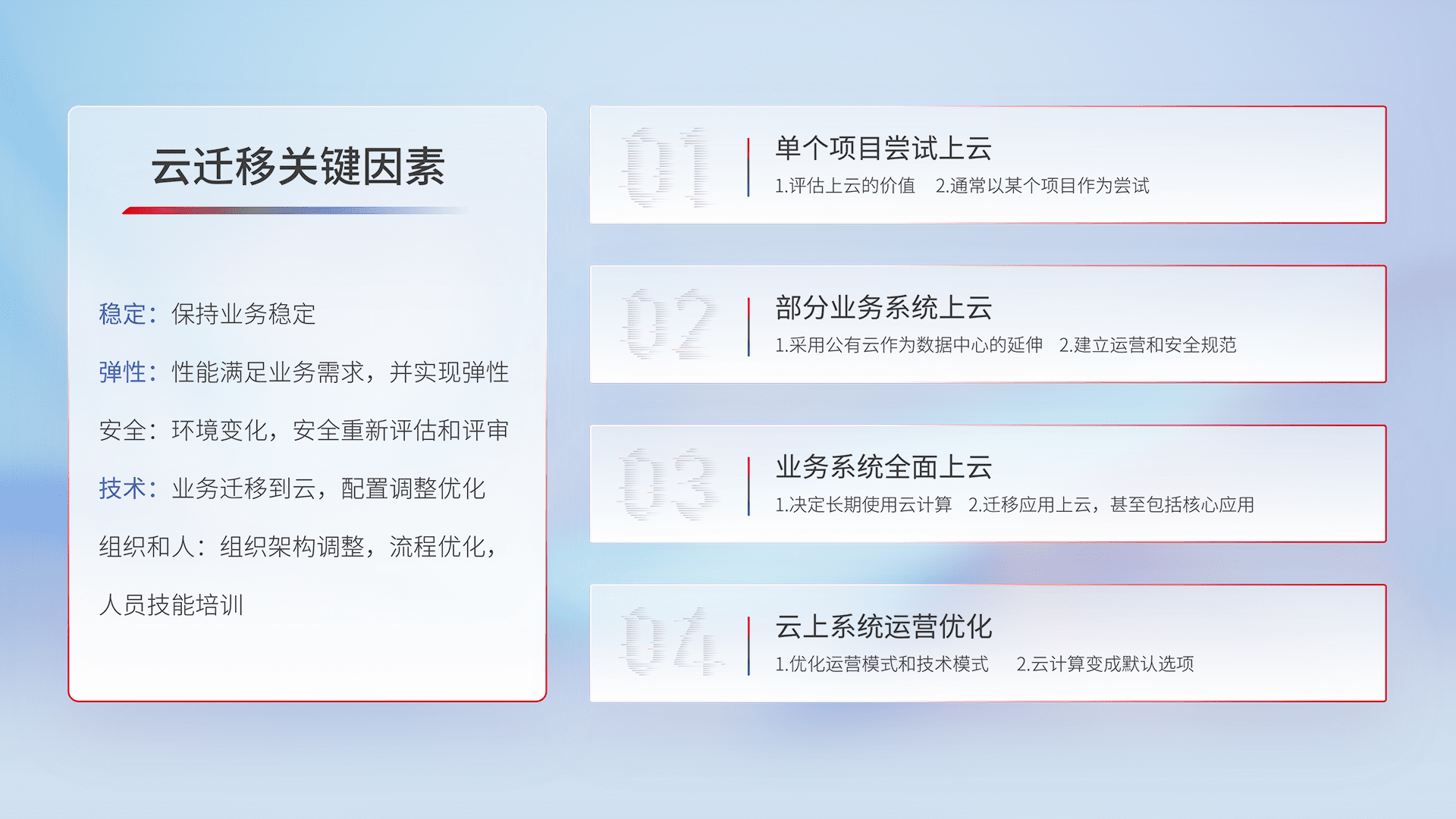 结合实际业务,,,,从规划设计、、、云平台选型、、云原生改造、、、数据迁移、、集成交付,,,,迁移全过程为客户识别最佳上云路径,,做好风险识别管理,,设计网络架构、、、身份权限、、安全审计合规、、、、操作审计、、、日志审计、、、、监控告警策略、、多站点容灾设计等,,对云上基础设施进行整体规划,,提升IT治理水平,,,,以满足弹性、、高可用、、、、高性能的需求。。。