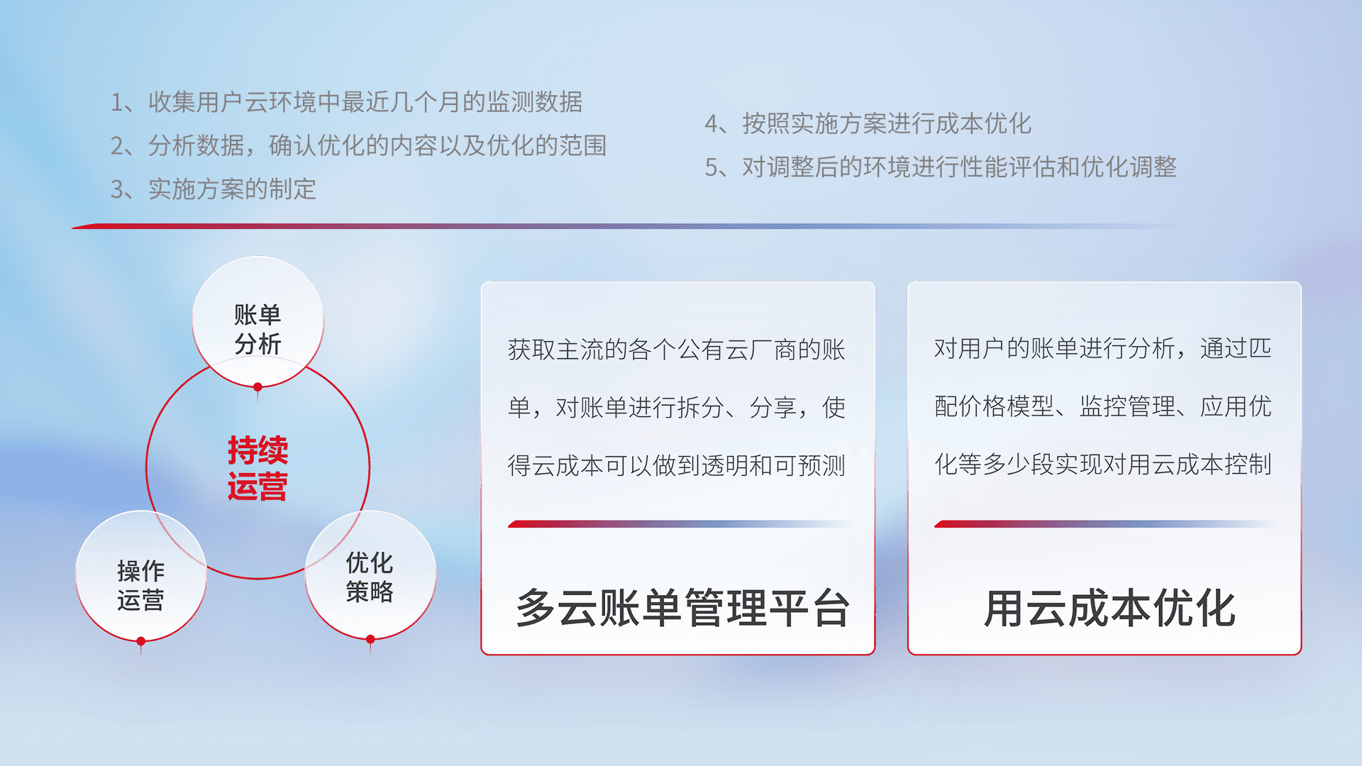 通过多云纳管,,,,以统一的资源数据模型把客户的云资源进行抽象和封装,,,,进而实现对多云资源的统一操作,,,,保障云资源管理的可靠性、、稳定性与可用性。。量身定制化运维内容,,配置、、、、开发运维、、、、补丁管理、、、、备份、、监控、、、认证和访问管理、、、、审计和日常巡检等,,,,保障在用云过程中的可靠度,,,,稳定度以及高可用率。。