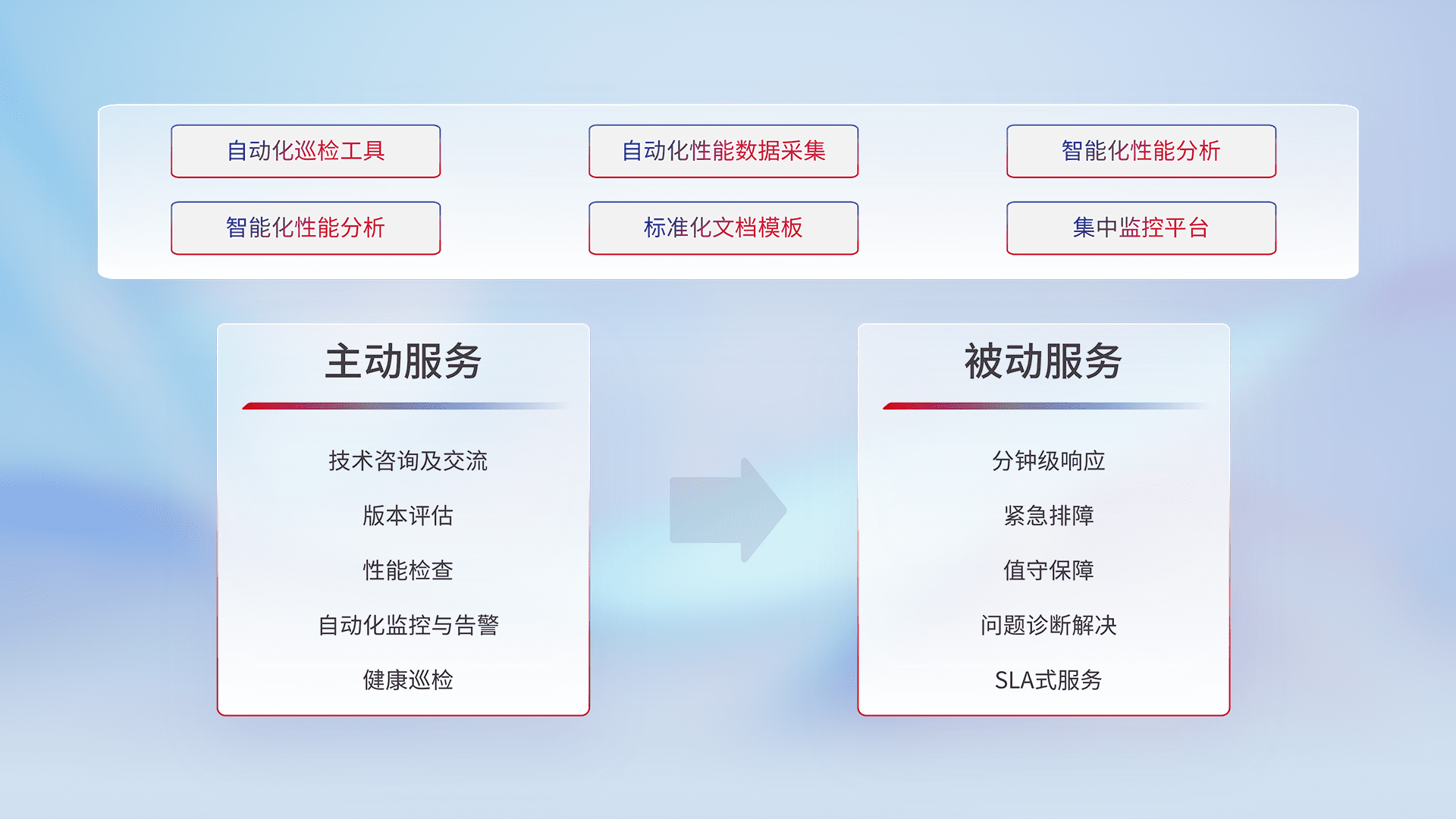 智能化工具和标准化文档,,,保障服务质量,,,提供主动服务(包含技术咨询、、版本评估、、、性能检查、、、、自动化监控与告警、、健康巡检)和被动服务包含(分钟级响应、、紧急排障、、、、值守保障、、、、问题诊断解决、、、SLA服务)。。。。